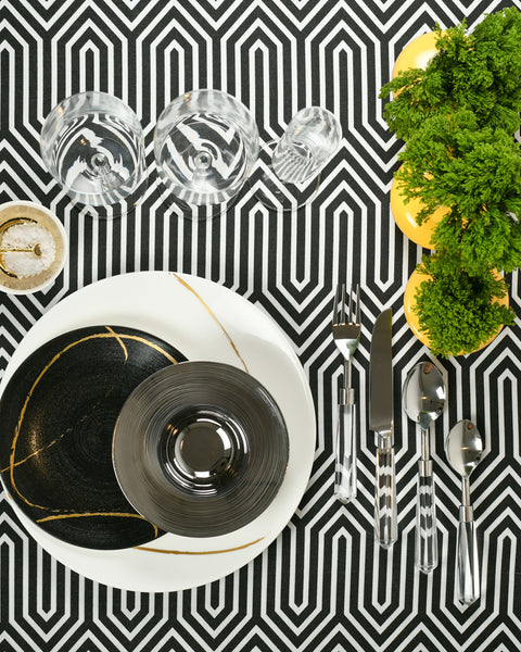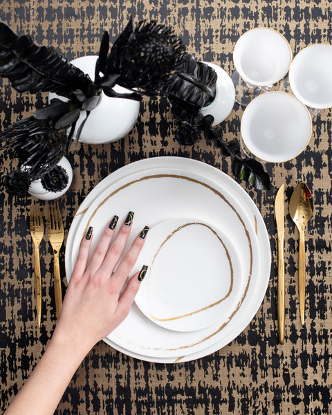 Maison de Carine presents the Eclipse Collection, handmade in Derby's English Pottery District by Royal Crown Derby's skilled artists. The 22K gold pattern resembles a stetched brushstroke, creating a modern and luxiorious look for the table. Available in black and white, this collection is the perfect artisitc touch to let shine on it's own or mix with other collections for a truly unique look.